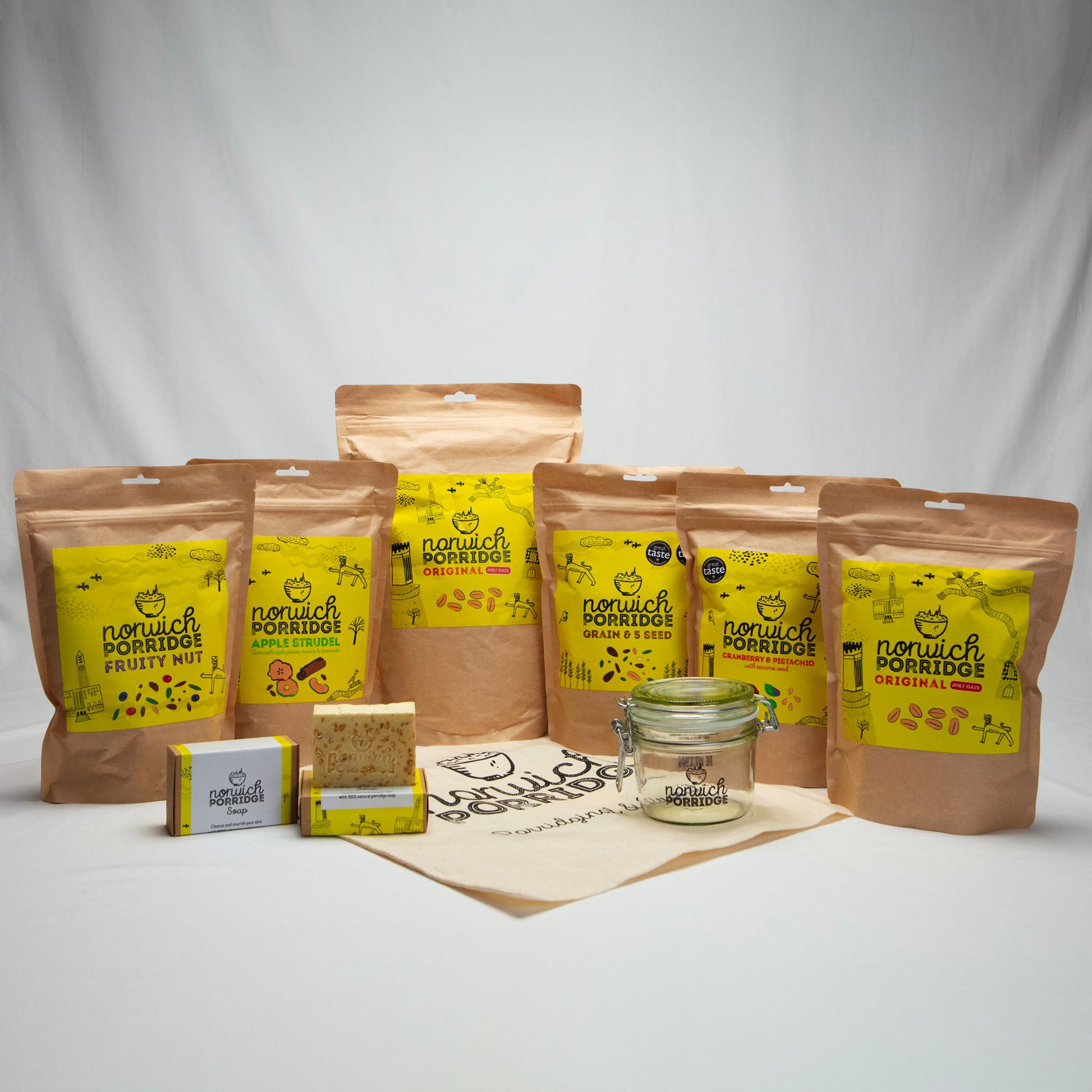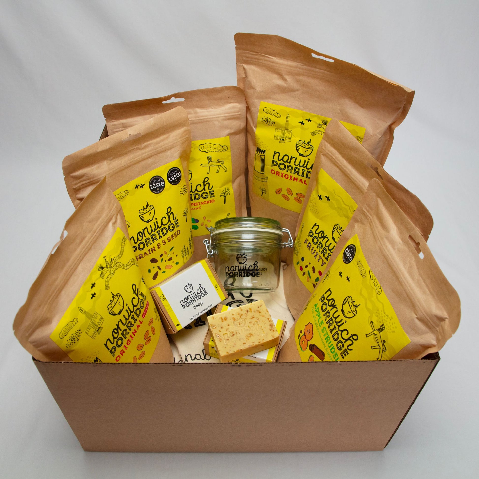 In this sustainably considerate hamper box, made of recyclable materials, you’ll find the whole Norwich Porridge Shebang!