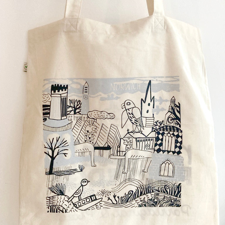 You'll look totes amaze strutting along with Norwich city in doodle form. You'll also feel totes sustainable as this bag is 100% organic cotton and climate neutral.